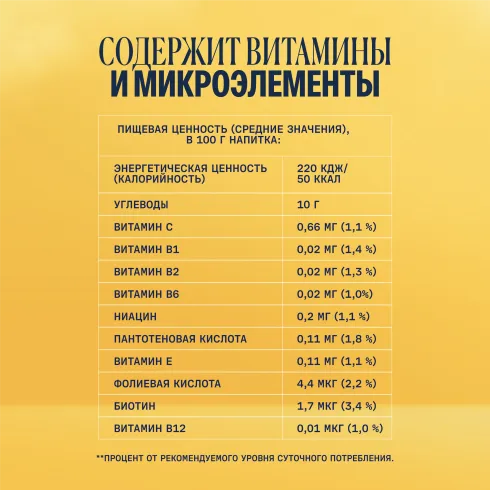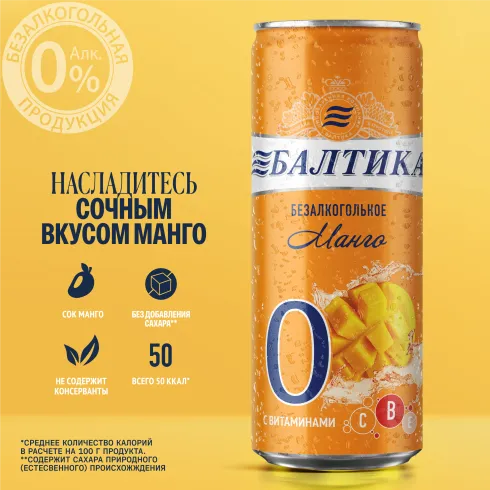 вода питьевая очищенная, солод пивоваренный ячменный светлый, регулятор кислотности лимонная кислота, солодовый экстракт, ароматизатор пищевой «Манго» (регулятор кислотности уксусная кислота, антиокислитель аскорбиновая кислота), растительный экстракт (экстракт сафлора), сок черной моркови концентрированный, концентрированный сок из манго осветленный, витаминный премикс (витамин Е, витамин В1, витамин В2, витамин В6, ниацин, фолиевая кислота, пантотеновая кислота, биотин, витамин В12, витамин С), хмелепродукты.