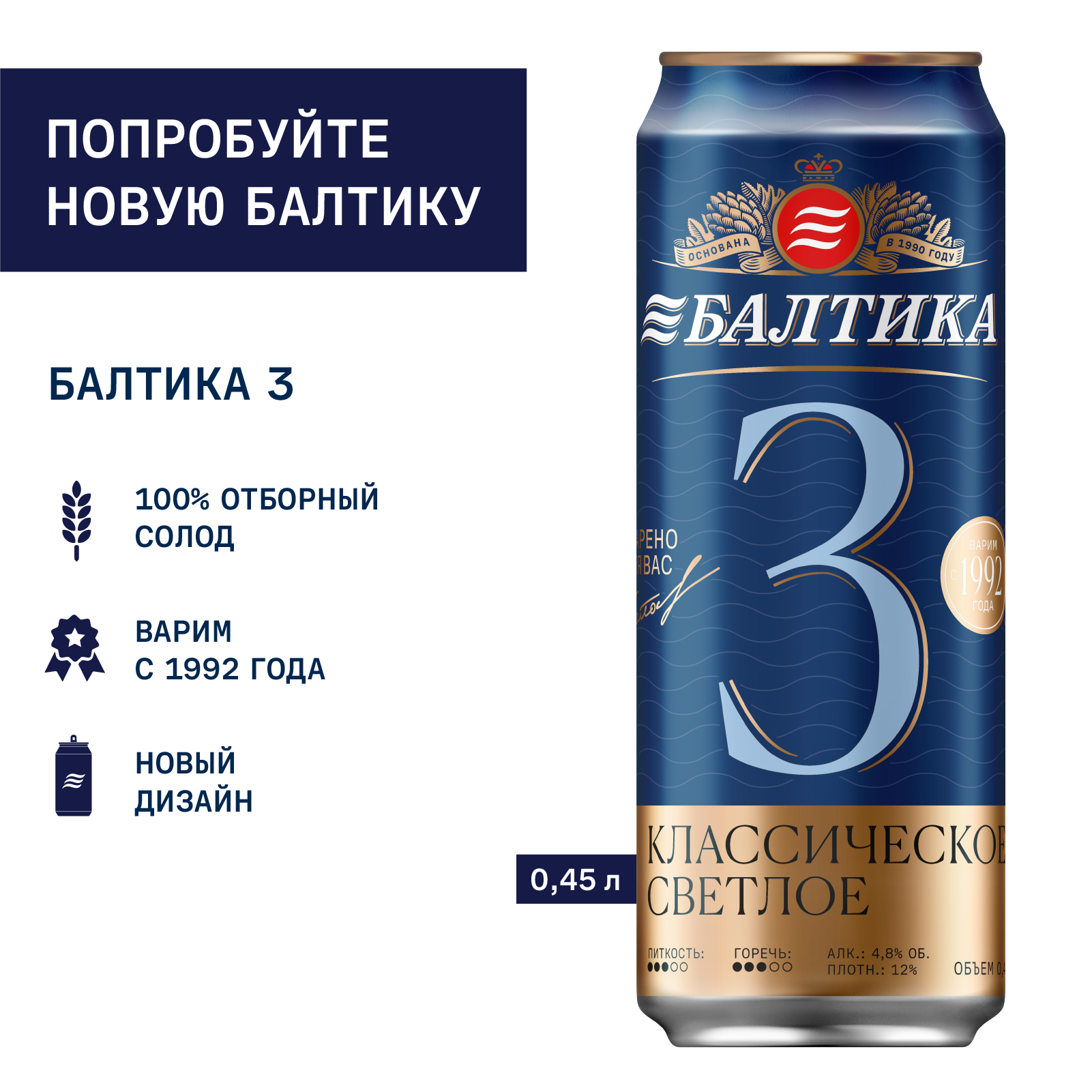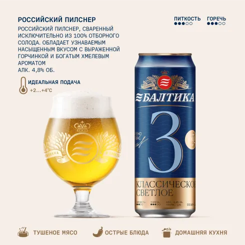 Балтика №3 — это классический светлый лагер, сваренный исключительно из 100% российского солода, подробнееБалтика №3 — это классический светлый лагер, сваренный исключительно из 100% российского солода, который придает пиву насыщенный, глубокий вкус. Ароматный хмель из Чувашии придает пиву яркий хмелевой аромат и выраженную, но приятную горчинку