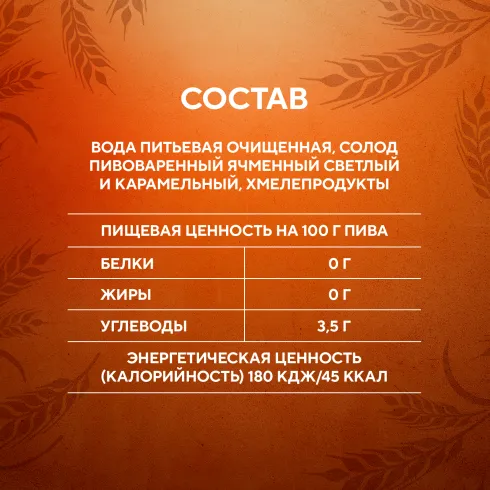 вода питьевая очищенная, солод пивоваренный ячменный светлый и карамельный, хмелепродукты.