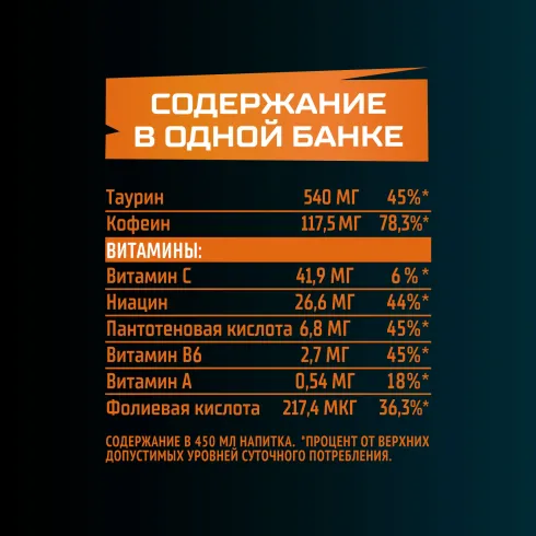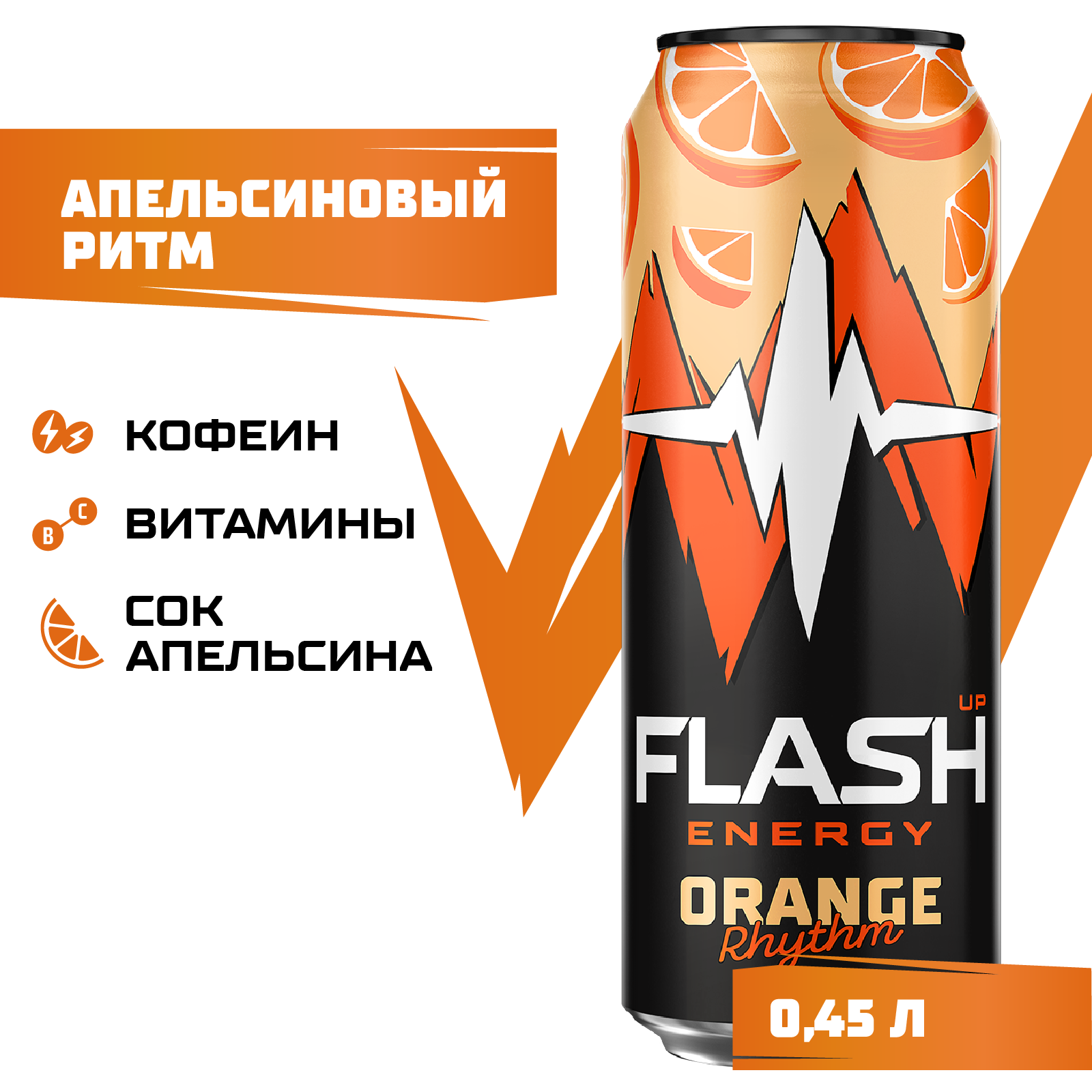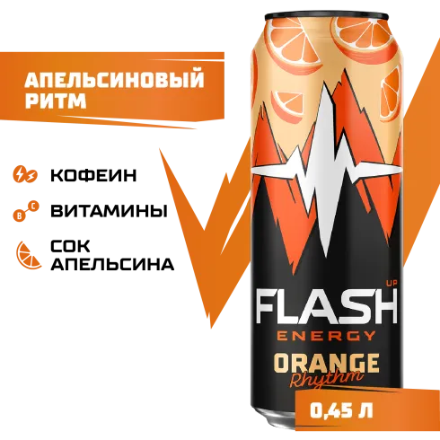 Вода питьевая очищенная, сахар, вкусо-ароматическая основа «Апельсиновый ритм» (таурин, ароматизатор, витамин C, кофеин, ниацин, пантотеновая кислота, бета-каротин, витамин B6, фолиевая кислота), регулятор кислотности кислота лимонная, антиокислитель кислота аскорбиновая, сок концентрированный апельсиновый, консерванты: сорбат калия и бензоат натрия