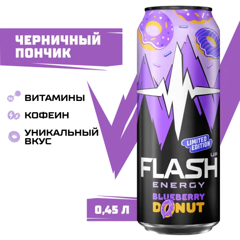 вода питьевая очищенная, сахар, регуляторы кислотности: лимонная кислота и цитрат натрия, концентрат для напитков «Энерджимикс» (таурин, витамин С, мальтодекстрин, кофеин, ниацин, пантотеновая кислота, витамин B6, фолиевая кислота), ароматизатор пищевой эмульсионный «Ваниль» (стабилизаторы: Е414, Е444, Е445), ароматизаторы пищевые, сок концентрированный из черники, красители: Е122 и Е133, консерванты: сорбат калия и бензоат натрия.