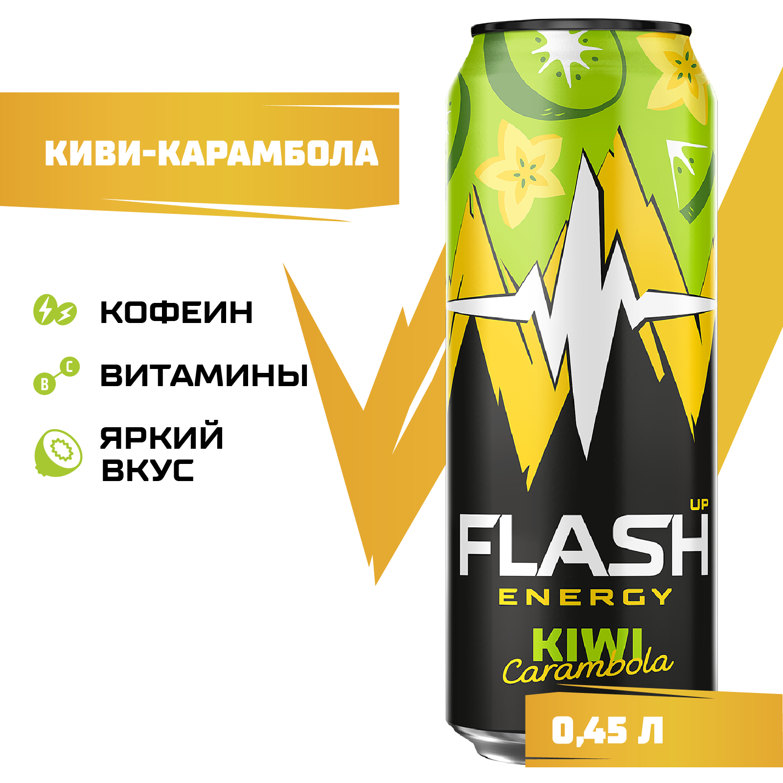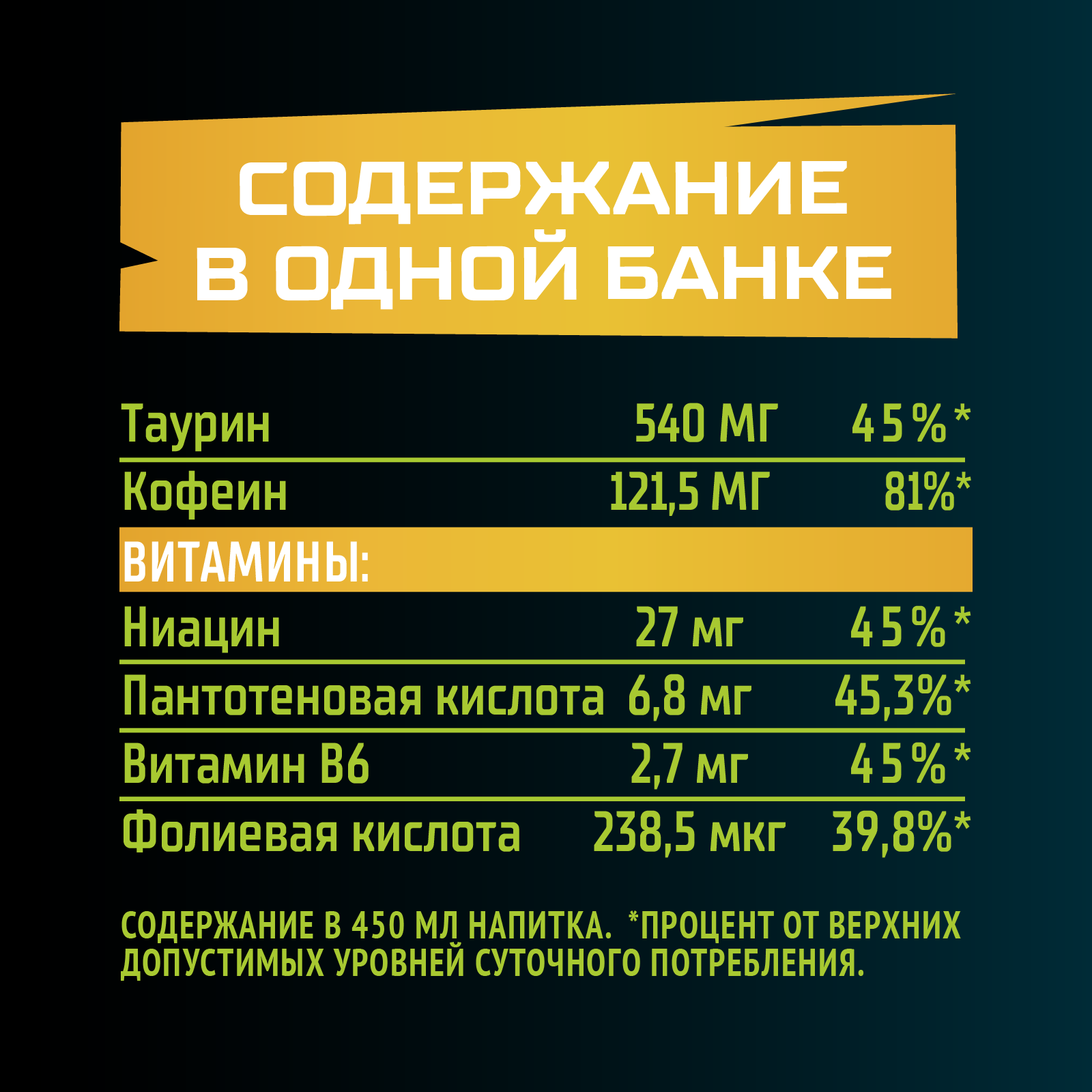 вода питьевая очищенная, сахар, регуляторы кислотности: лимонная кислота и цитрат натрия, концентрат для напитков «Энергия» (таурин, мальтодекстрин, кофеин, ниацин, пантотеновая кислота, витамин B6, фолиевая кислота), комплексная пищевая добавка со вкусом киви и карамболы (ароматизатор, красители: тартразин и синий патентованный), комплексная пищевая добавка «Нейтральная эмульсия» (стабилизаторы: гуммиарабик и E445, терпены, антиокислитель E320), подсластители: ацесульфам калия, цикламат натрия, сахаринат натрия, консерванты: сорбат калия и бензоат натрия
