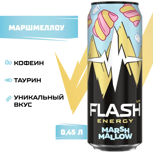 вода питьевая очищенная, сахар, регулятор кислотности лимонная кислота, концентрат для напитков «Энерджимикс» (таурин, витамин С, мальтодекстрин, кофеин, ниацин, пантотеновая кислота, витамин B6, фолиевая кислота), ароматизатор пищевой «Маршмеллоу», ароматизатор пищевой «Ваниль» (стабилизаторы: Е414, Е444, Е445), подсластители: ацесульфам калия, цикламат натрия, сахаринат натрия, консерванты: сорбат калия и бензоат натрия