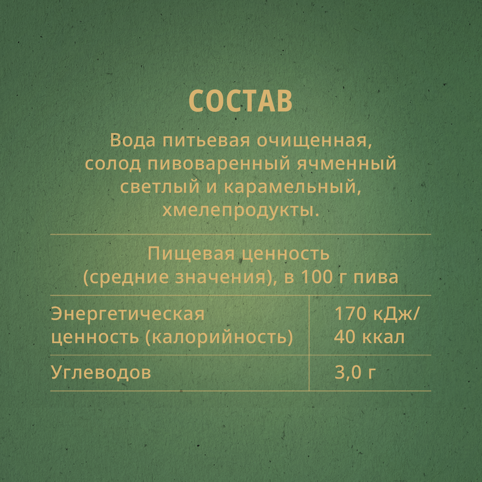 вода питьевая очищенная, солод пивоваренный ячменный светлый и карамельный, хмелепродукты.