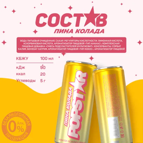 вода питьевая очищенная, сахар, регуляторы кислотности: лимонная кислота, аскорбиновая кислота, ароматизатор пищевой «Тип Ананас» (стабилизаторы: E414, Е445, краситель бета-каротин (Е160а)), комплексная пищевая добавка «Смесь подсластителей Мультисвит» (подсластители: Е952, Е955, Е954), консерванты: сорбат калия, бензоат натрия, ароматизатор пищевой «Тип Кокос», ароматизатор пищевой «Тип Ром».