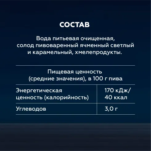 вода питьевая очищенная, солод пивоваренный ячменный светлый и карамельный, хмелепродукты.