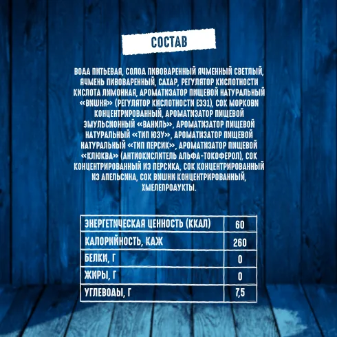 вода питьевая, солод пивоваренный ячменный светлый, ячмень пивоваренный, сахар, регулятор кислотности кислота лимонная, ароматизатор пищевой натуральный «Вишня» (регулятор кислотности Е331), сок моркови концентрированный, ароматизатор пищевой эмульсионный «Ваниль» (стабилизаторы: E414, E444, E445, регулятор кислотности Е330, консерванты: Е202, Е211), ароматизатор пищевой натуральный «тип Юзу», ароматизатор пищевой натуральный «тип Персик», ароматизатор пищевой «Клюква» (антиокислитель альфа-токоферол), сок концентрированный из персика, сок концентрированный из апельсина, сок вишни концентрированный, хмелепродукты.