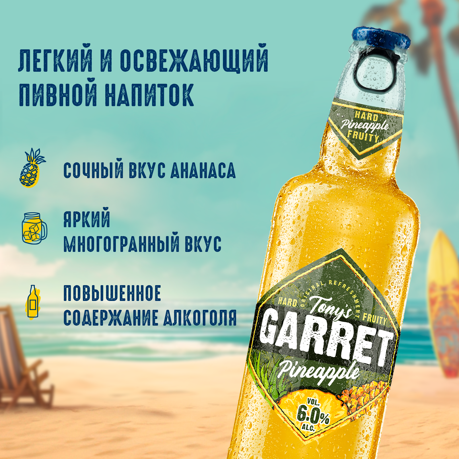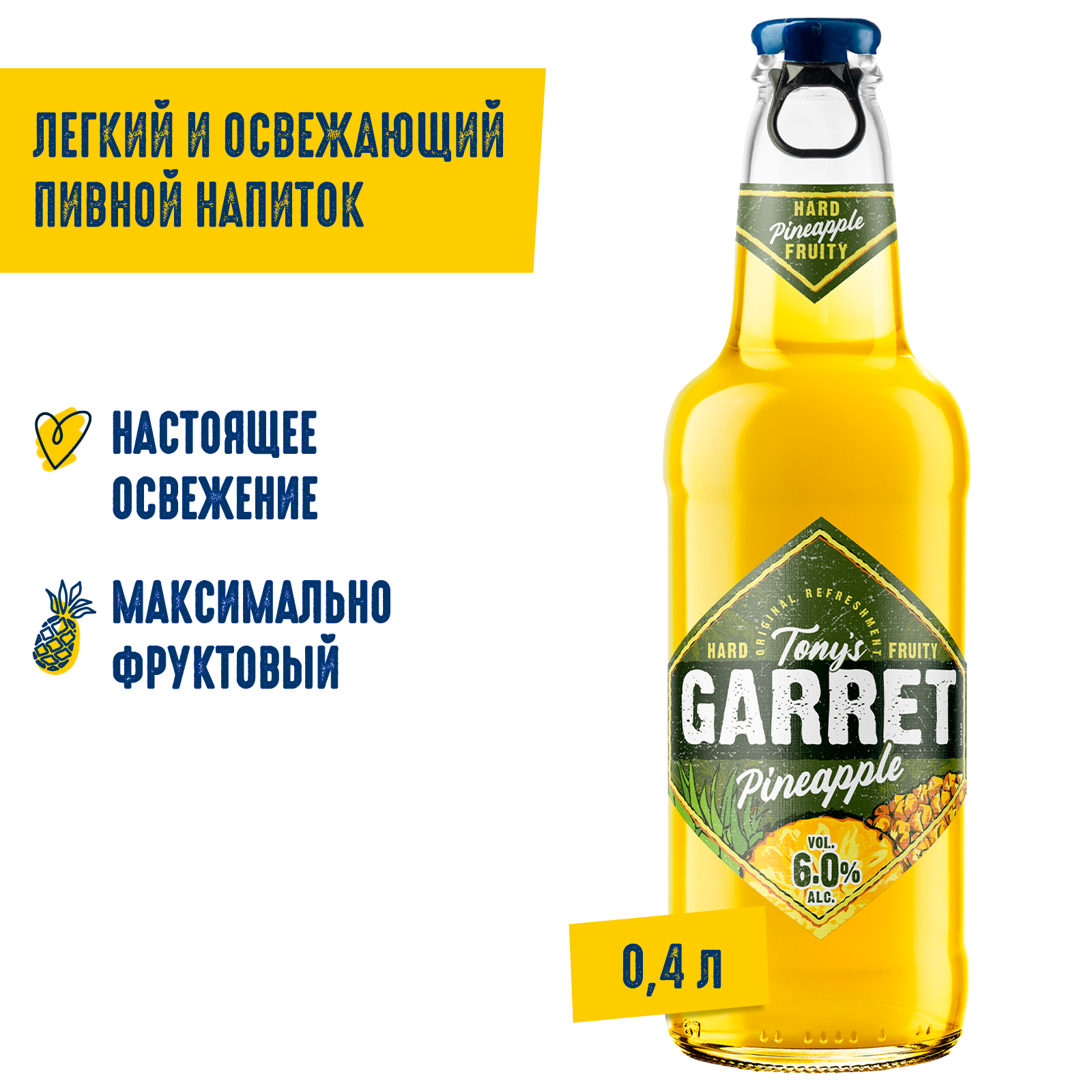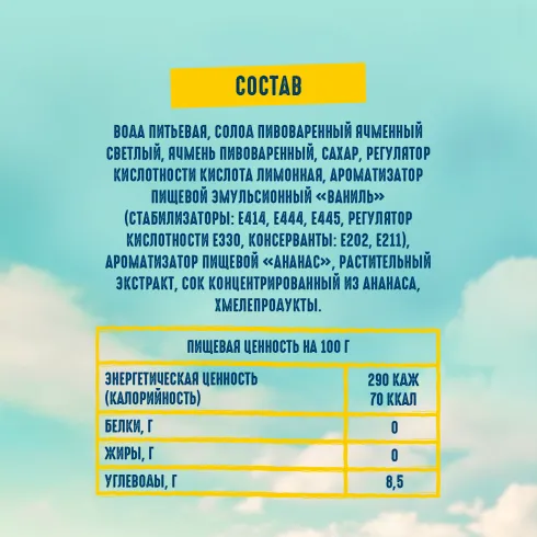 вода питьевая, солод пивоваренный ячменный светлый, ячмень пивоваренный, сахар, регулятор кислотности кислота лимонная, ароматизатор пищевой эмульсионный «Ваниль» (стабилизаторы: E414, E444, E445, регулятор кислотности Е330, консерванты: Е202, Е211), ароматизатор пищевой «Ананас», растительный экстракт, сок концентрированный из ананаса, хмелепродукты